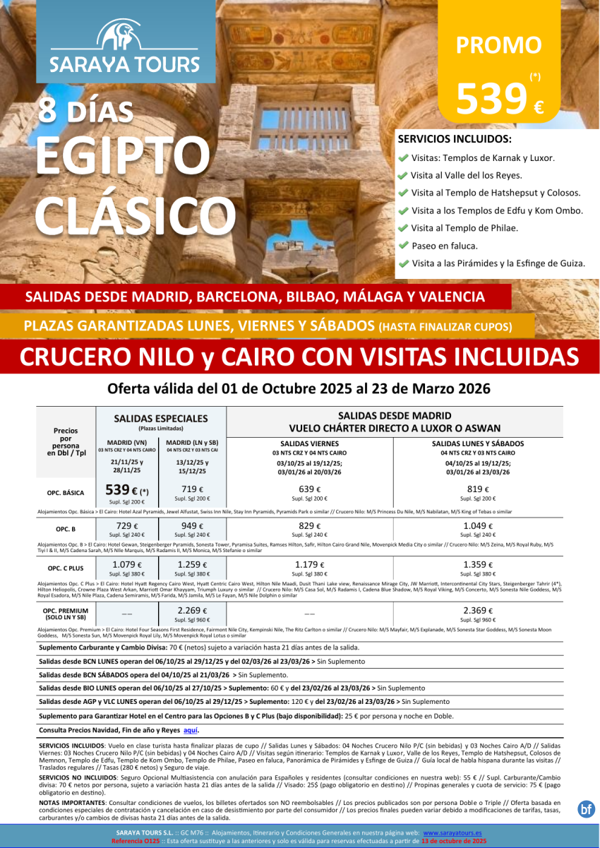 Egipto Clásico 8 días. *Salidas Bcn, Mad ,Agp ,Bio & Vlc * Crucero y Cairo + visitas dsd 499€ hasta Sept26